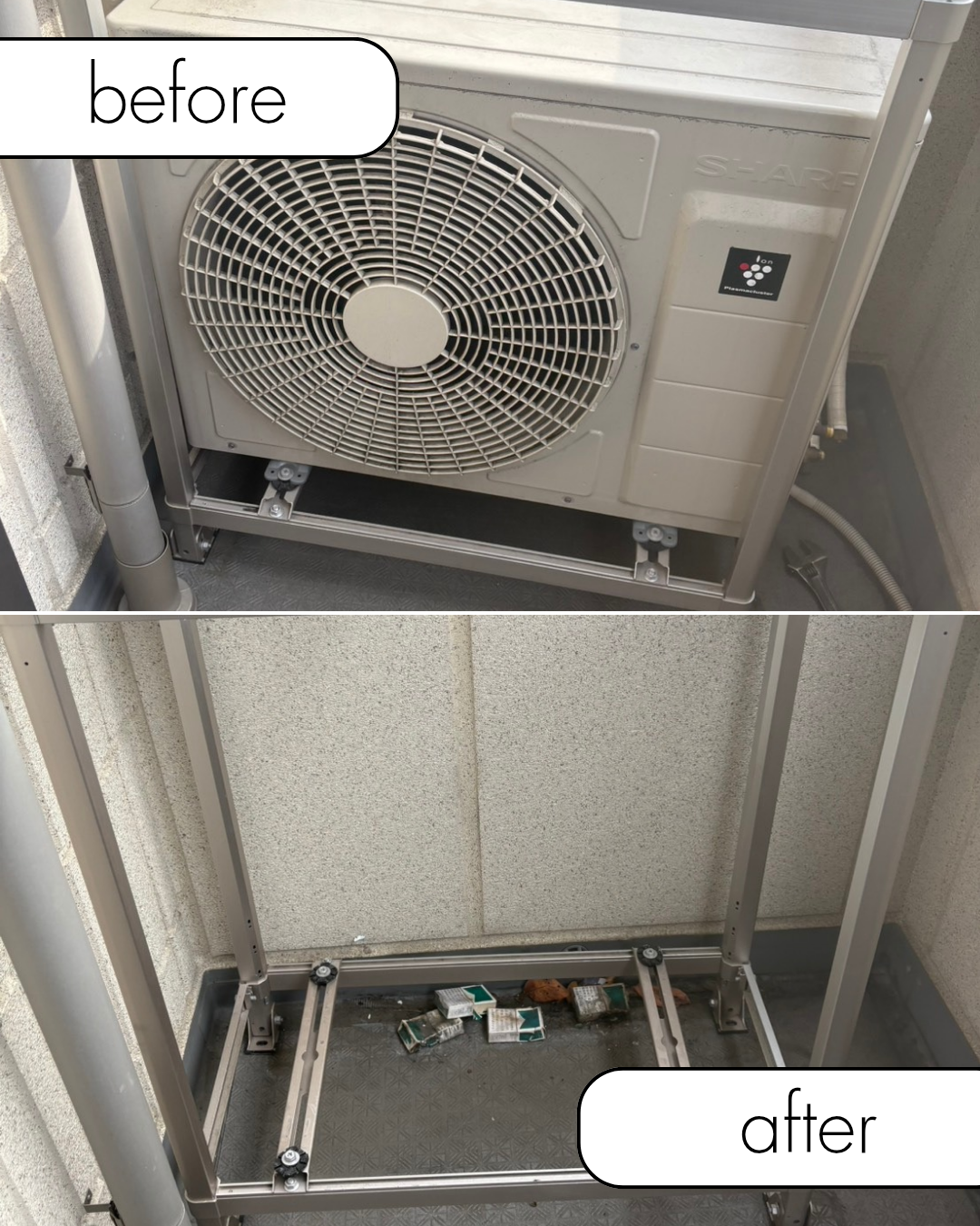 ベランダ置きや地面置きなど、標準的な設置状況であれば、取り外し工賃から回収費用まで0円で対応可能です。
